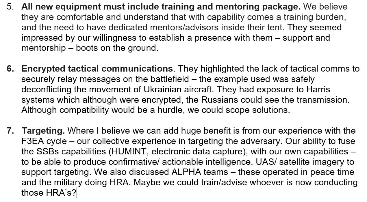 F3EA is a military doctrine honed during the criminal 2003 Anglo-American invasion of Iraq, and subsequent occupation. Under its auspices, targets are identified, kept under continuous surveillance, captured or killed, intelligence gathered from them, then this trove analyzed to identify further targeting opportunities. The SBU was reportedly “impressed” with the pitch presented by Prevail and TIW via Peter Becker, and welcomed having “dedicated mentors/advisors inside their tent,” which was said to amount to “boots on the ground”.
