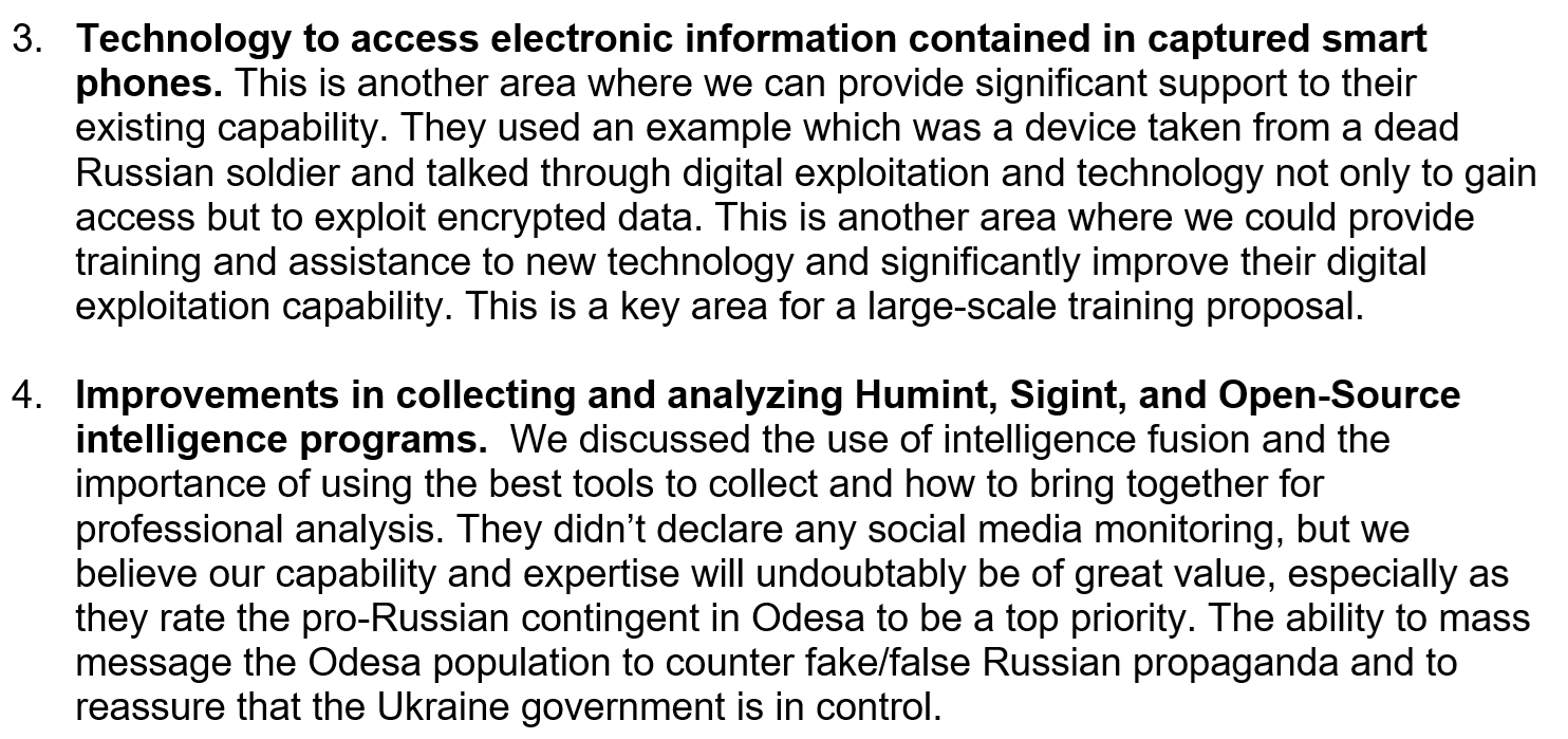 Conducted in the proxy war’s initial stages, a subsequent “capability proposal” was circulated among Prevail and TIW in April 2022 based on the discussion, which focused “on targeting and specialist capability to support that function.” This not only applied to military contexts, but domestic operations against Ukraine’s “pro-Russian contingent.” The proposal noted “tracking and monitoring of devices played a key role in the conversation,” and “improved technology to intercept and monitor social media, messaging, emails, smart phone transmissions” were key needs for the SBU.