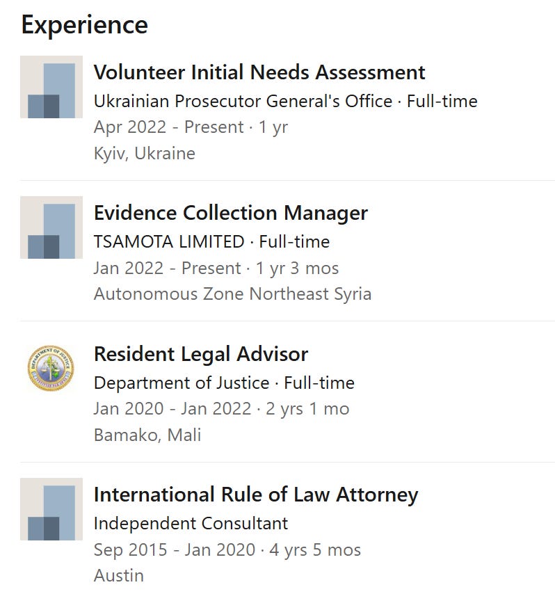 Its landing page also provided identities of TIW staffers. Among them was Peter Becker, a US military journeyman who subsequently diversified into international law in Afghanistan and Iraq. His LinkedIn profile suggests he has served since early 2022 as an “evidence collection manager” for Tsamota in Northeast Syria, while simultaneously working in the Ukrainian Prosecutor General’s Office. Moreover, leaked documents indicate Becker led a private consultation with the Odessa SBU’s deputy director on how Prevail and TIW could assist the agency’s operations.