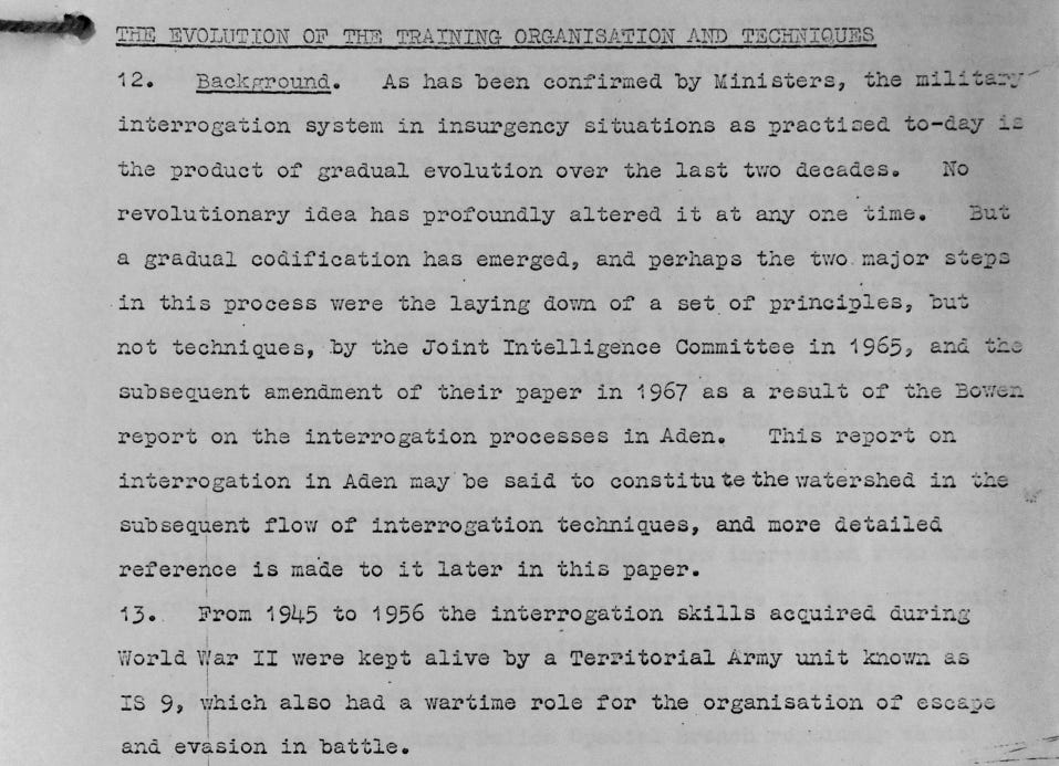 Still, what was done to detainees can only be considered barbarous in the absolute extreme. In November that year, a senior commandant within the British Army’s Intelligence Corps sketched an official history of the development of London’s military interrogation methods since World War II. Its contents were so sensitive, and shocking, senior government officials wished for the report to remain secret for a century. As it was, declassification came after just three decades.