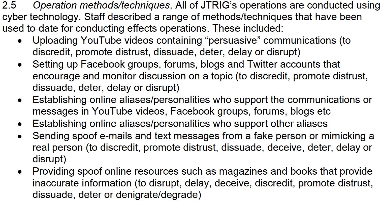 A separate leaked document on JTRIG’s operations notes the unit is engaged in “uploading YouTube videos containing ‘persuasive’ communications…setting up Facebook groups, forums, blogs and Twitter accounts that encourage and monitor discussion on a topic…Establishing online aliases/personalities who support the communications or messages in YouTube videos, Facebook groups, forums, blogs etc…Establishing online aliases/personalities who support other aliases.” JTRIG also sets up “spoof trade sites…that may take a customer’s money and/or send customers degraded or spoof products.”