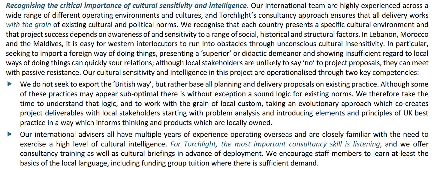 Nonetheless, “complex political and institutional landscapes” were predicted to “likely present engagement challenges” throughout the program, in particular “sensitivities with regards to access to data.” Given the “possibility of reluctance” to allow British intelligence full access, “rapidly developing relationships of trust” was key. The “privilege” of Torchlight’s office within LAF headquarters was to be leveraged for the purpose. Perhaps more illuminatingly than intended, one file concludes by stating that for Torchlight, “the most important consultancy skill is listening.”