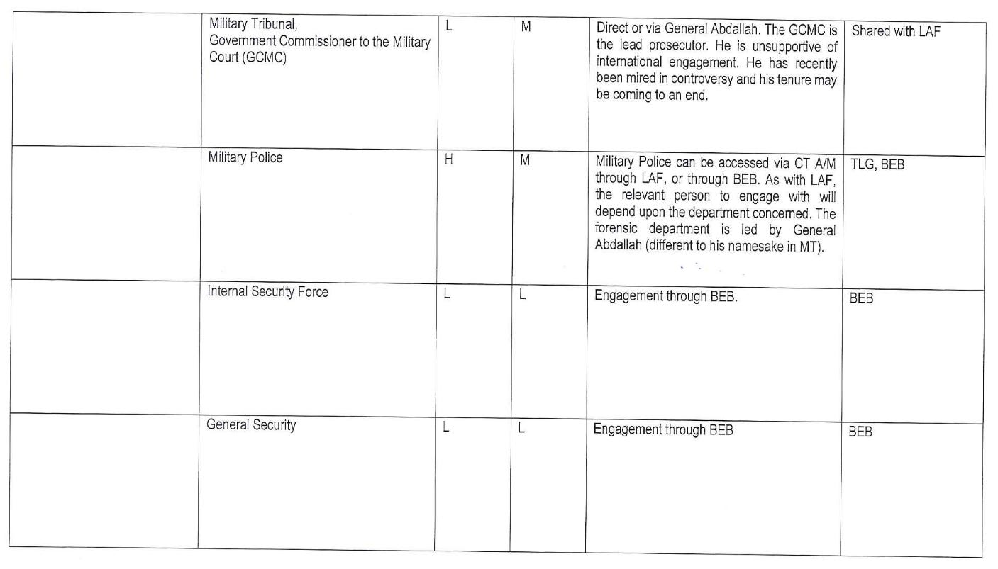 While local stakeholders were “unlikely to say ‘no’ to project proposals” as a result of Torchlight’s penetration, the company suggested its work could still “meet with passive resistance.” It’s clear certain elements and individuals within Beirut’s power structure were extremely wary of London’s activities. A document outlining engagement strategies for Lebanese government personnel notes the country’s military court commissioner was “unsupportive” of London’s involvement. However, due to having recently been “mired in controversy”, his tenure in the post was reportedly “coming to an end.”